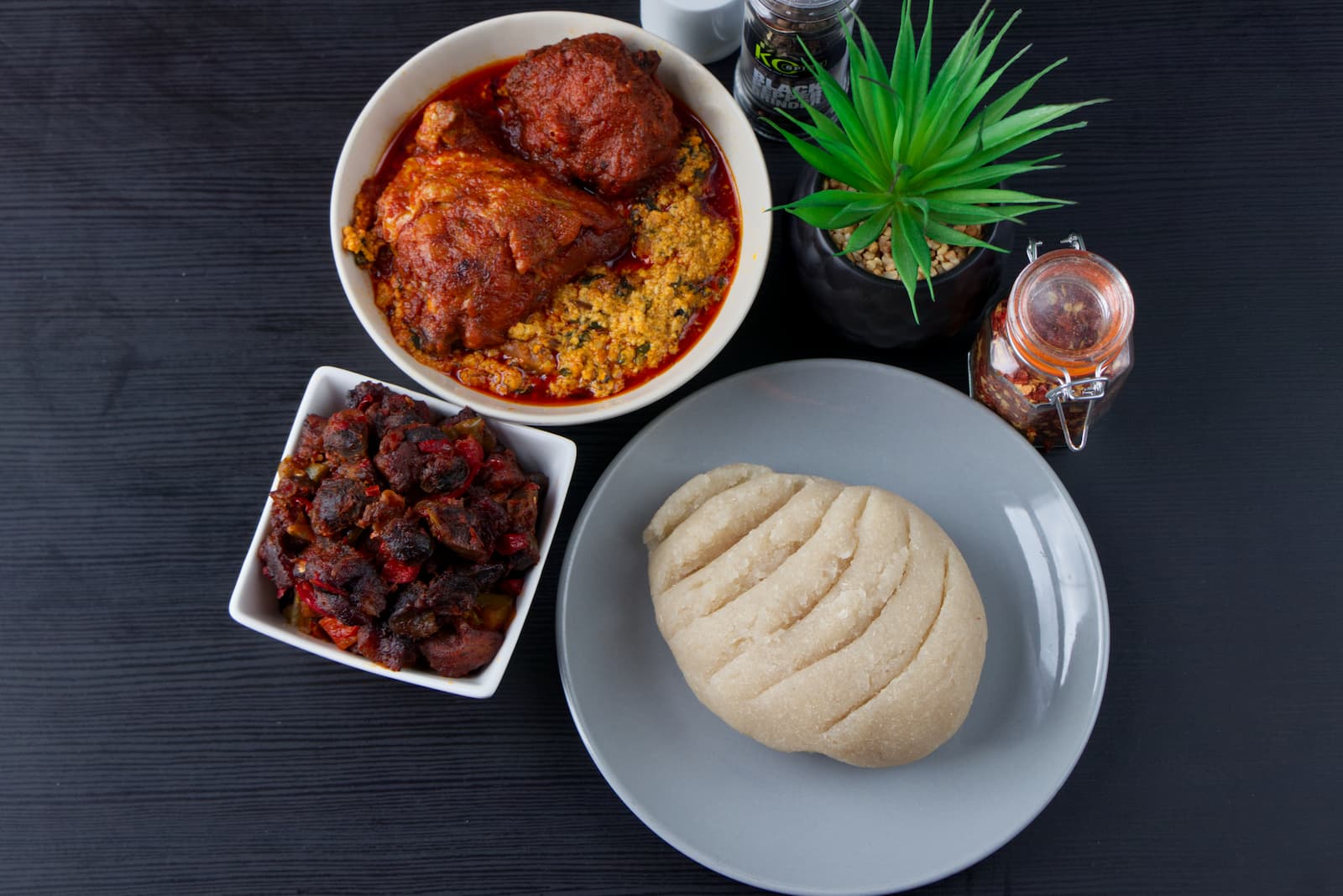 Asumptuous Nigerian dish combining the richness of Gbegiri (bean soup) and the tangy taste of Ewedu (jute leaf soup) and Amala.
